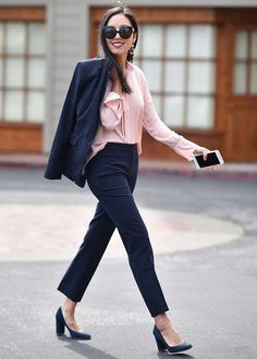 - Look ejecutivo chic: Pantalón azul marino de corte recto con una camisa blanca, blazer y tacones para un día de oficina.